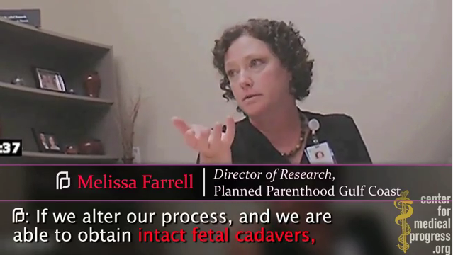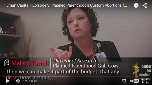 In the fifth video: Melissa Farrell of Planned Parenthood-Gulf Coast in Houston boasted of Planned Parenthood’s skill in obtaining “intact fetal cadavers” and how her “research” department “contributes so much to the bottom line of our organization here, you know we’re one of the largest affiliates, our Research Department is the largest in the United States.”